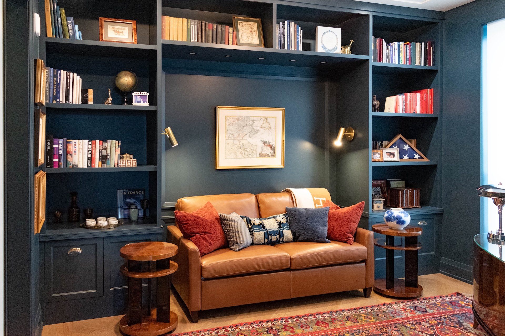 This openness allowed the design team to strike a balance between creating a vibrant space without creating overwhelm. Thematically, shades of blue are woven throughout the apartment, appearing in unexpected places like the sofas, headboard, and office space. "It’s fun because you can drop any color into the room, and it still works like a neutral base," Greg added.