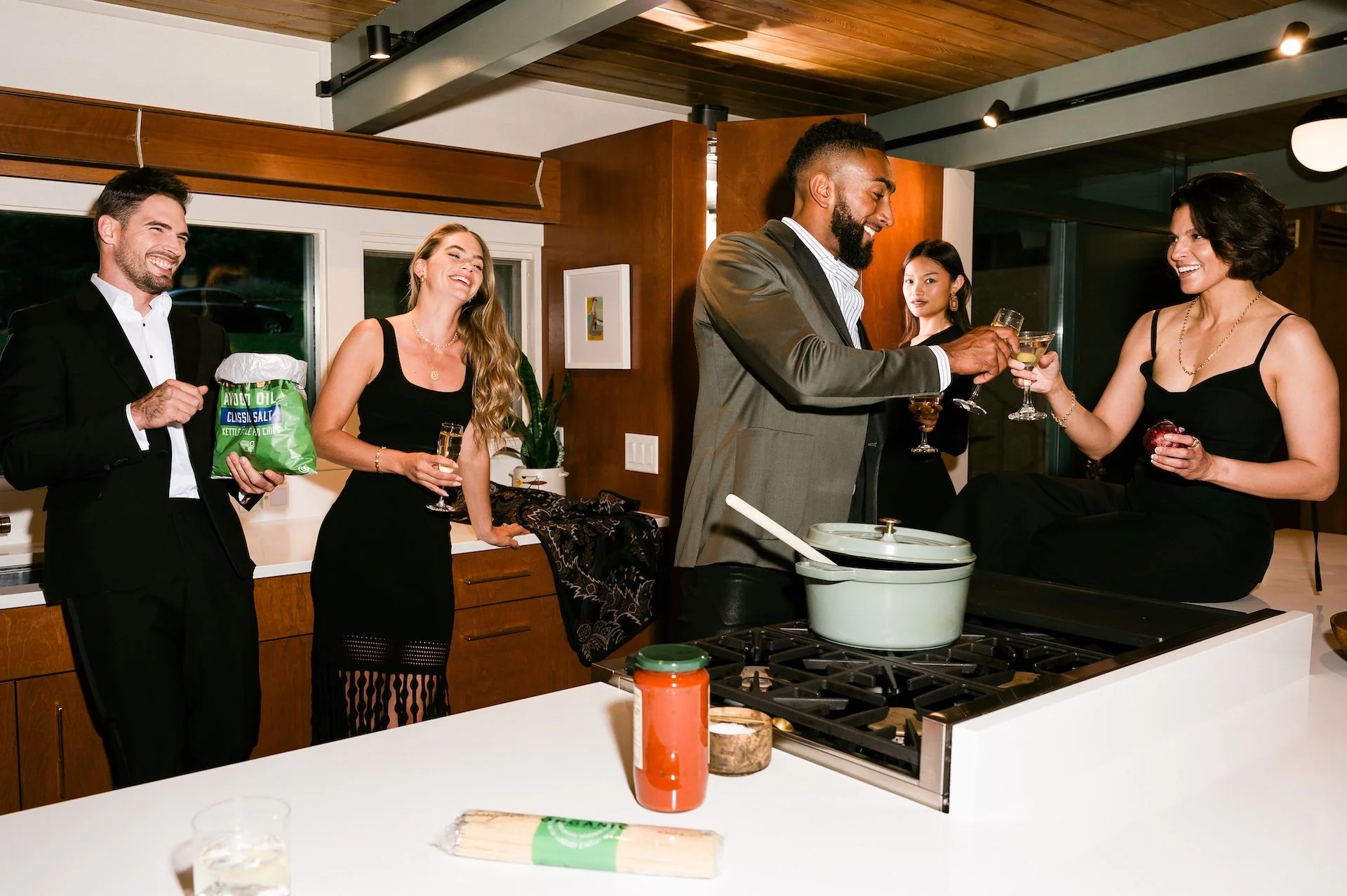 As the crisp autumn air sweeps through the colorfully changing trees, nothing beckons like a cozy weekend getaway with friends. This season, we capture the essence of fall fashion with laid-back cabin energy and a touch of glam. After a golden afternoon among the trees, the crew prepares for a night on the town. Upon returning, mischief ensues in the kitchen as they satisfy their late-night craving in style. Join us as we venture into a weekend where golden leaves and rich fabrics create the perfect backdrop for a memorable fall retreat.